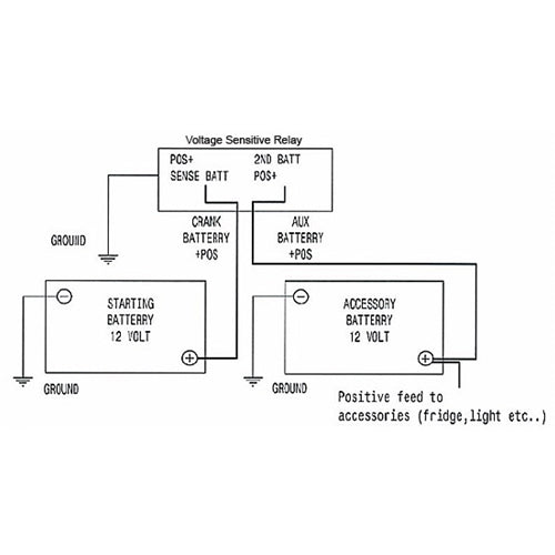 The smart battery isolator allows two batteries to be charged at the same time. When the engine is started and the start battery reaches 13.4 volts, the relay engages, allowing two battery banks (start and accessory) to be charged simultaneously. When the voltage drops below 12.9 volts (eg the engine is stopped), the relay disengages, separating the batteries. This system eliminates the possibility of draining the start battery and protects sensitive electronic equipment powered from the house